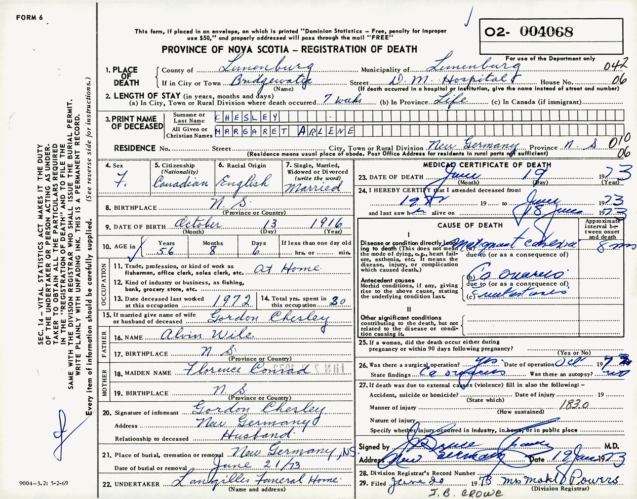 Female Death Registration: Year: 1973 number: 4068