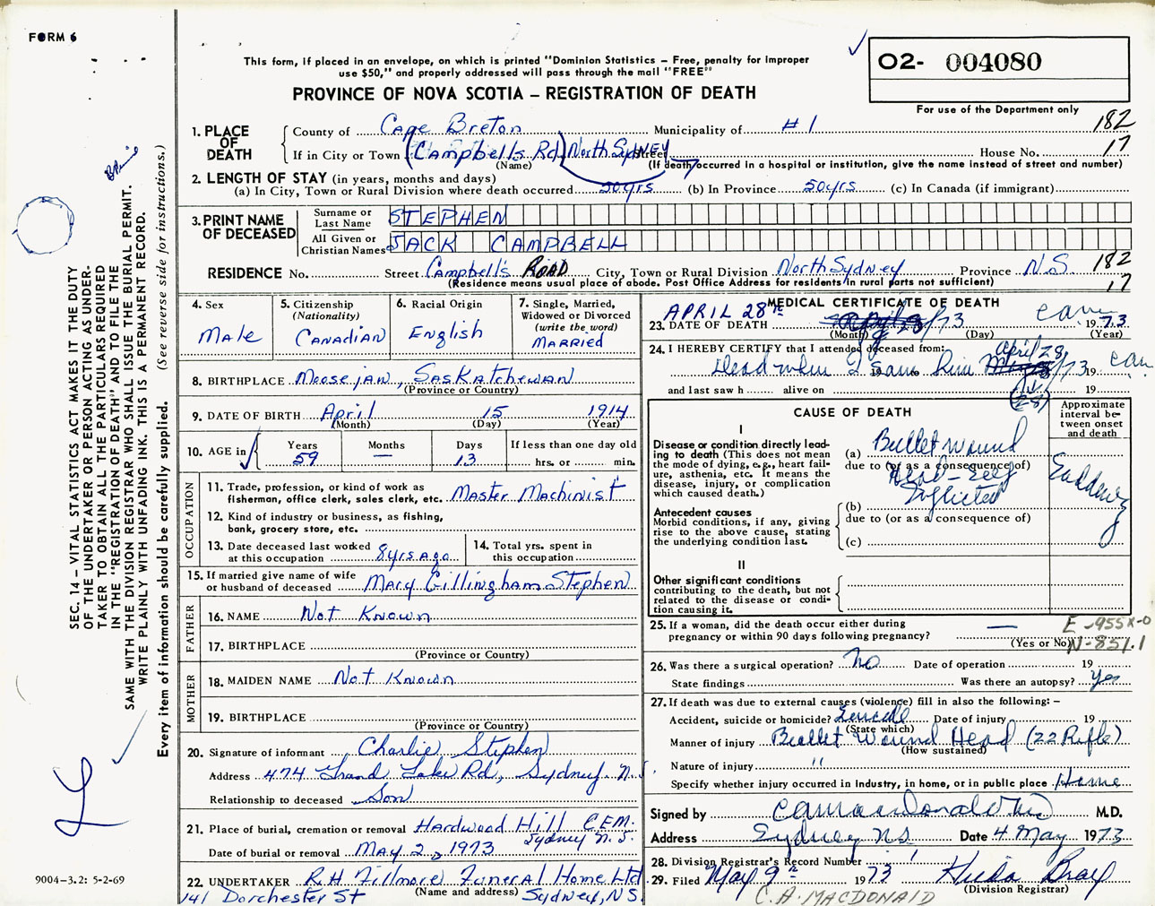 Male Death Registration: Year: 1973 number: 4080