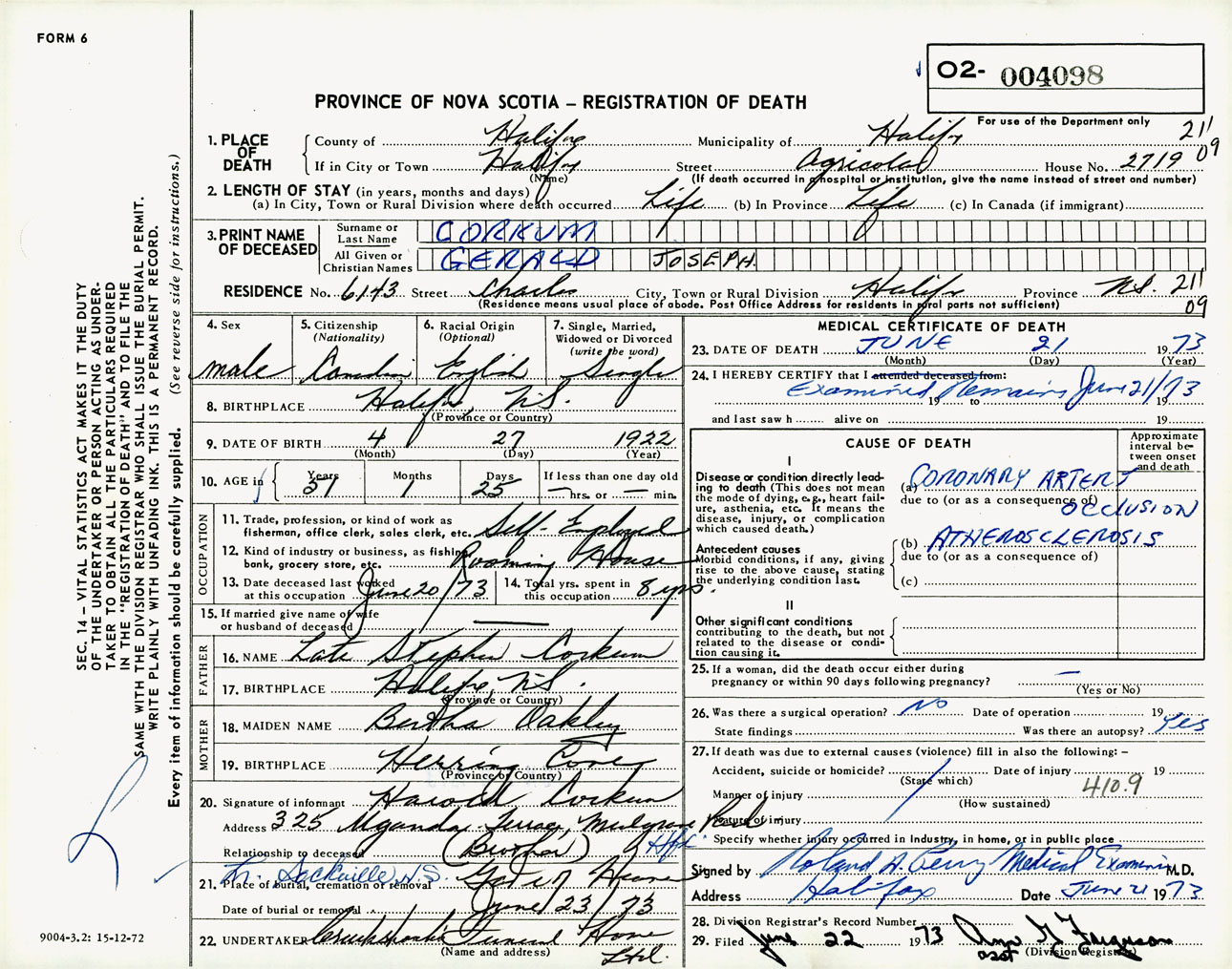Male Death Registration: Year: 1973 number: 4098