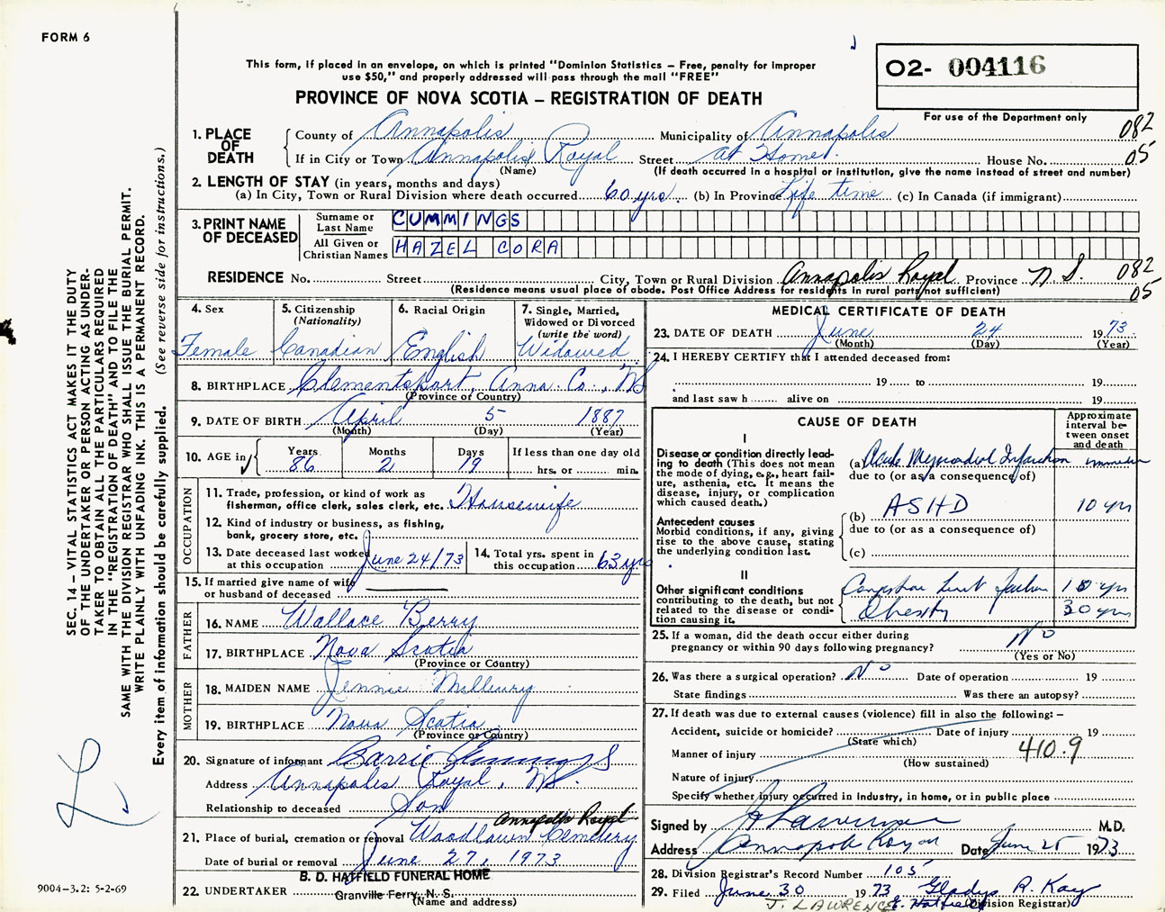 Female Death Registration: Year: 1973 number: 4116
