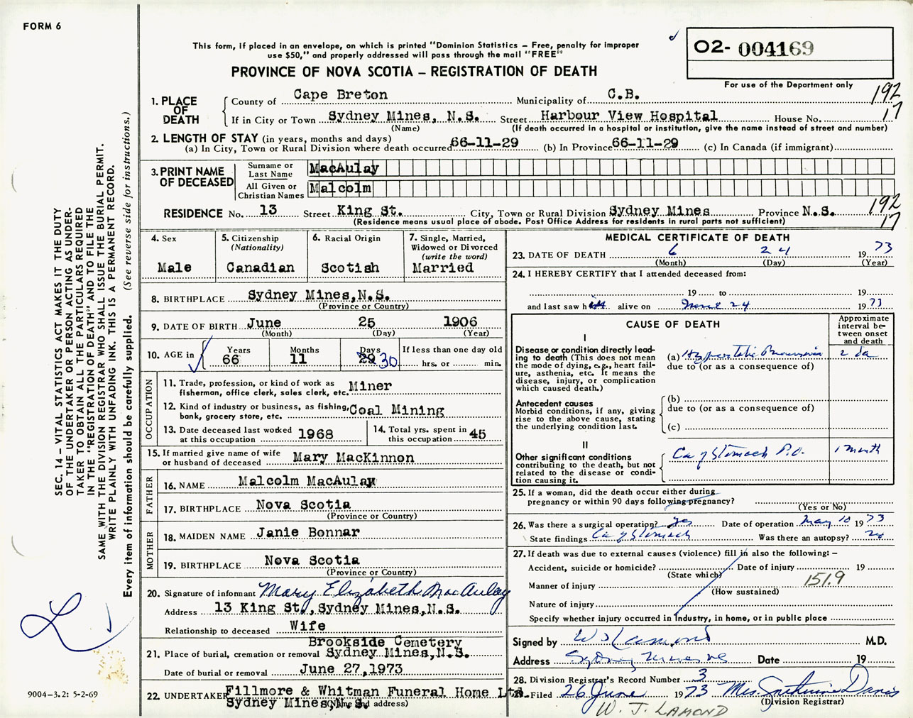 Male Death Registration: Year: 1973 number: 4169