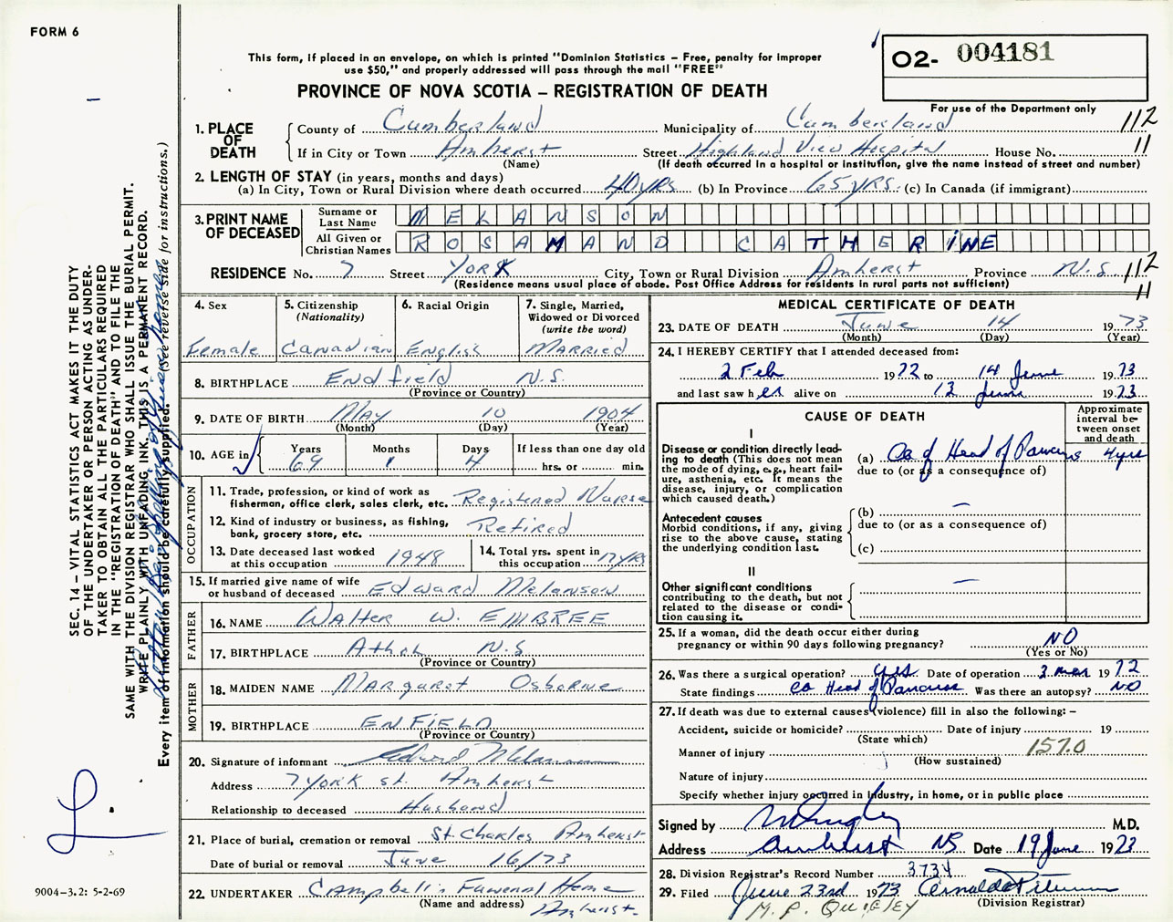 Female Death Registration: Year: 1973 number: 4181