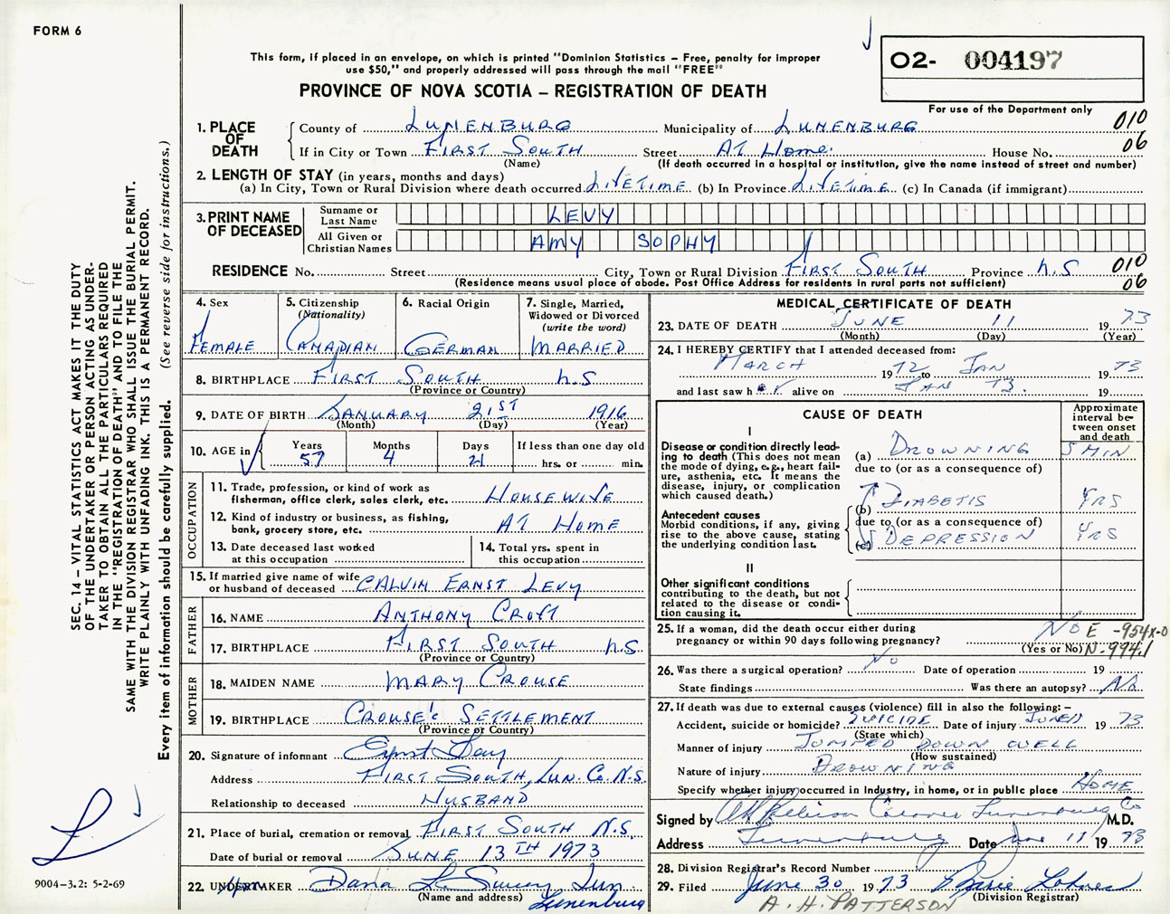 Female Death Registration: Year: 1973 number: 4197
