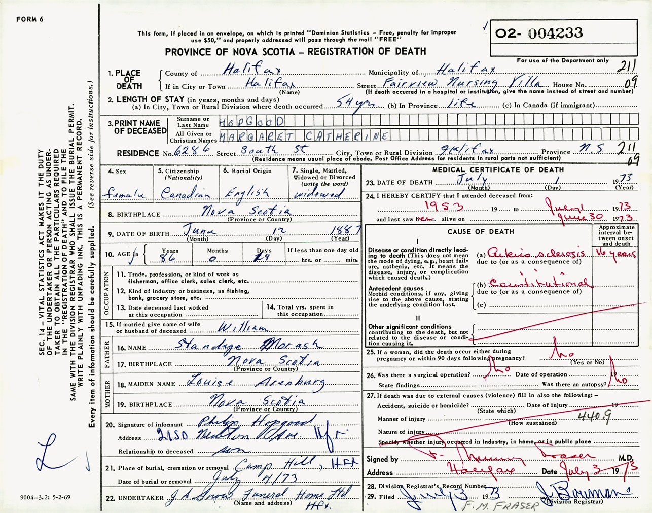 Female Death Registration: Year: 1973 number: 4233