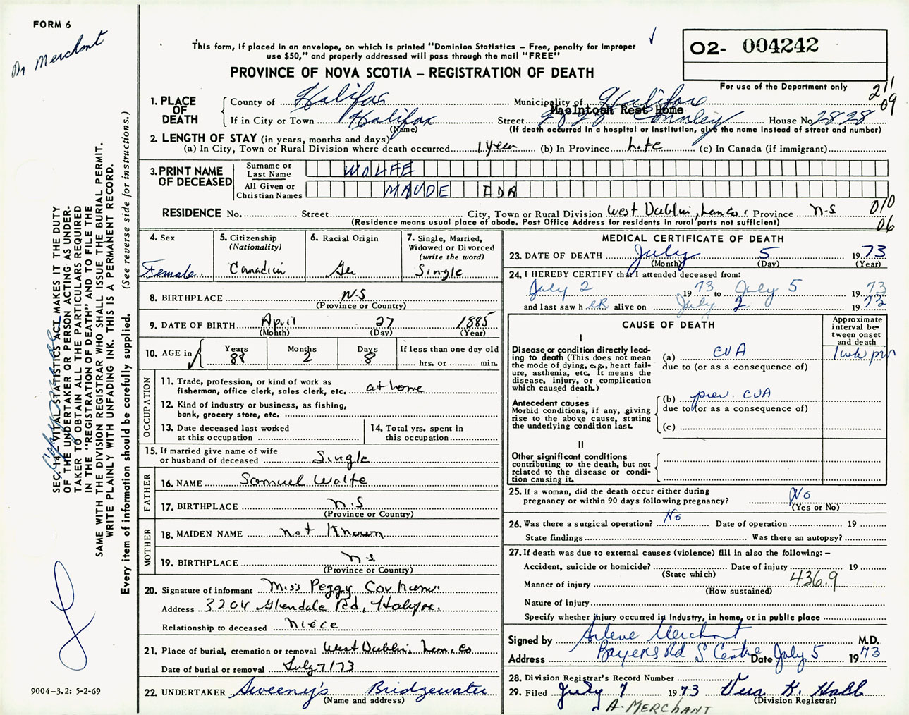 Female Death Registration: Year: 1973 number: 4242