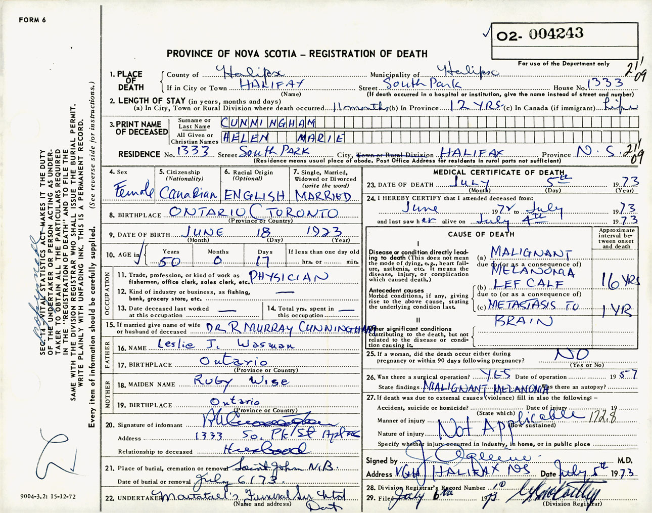Female Death Registration: Year: 1973 number: 4243