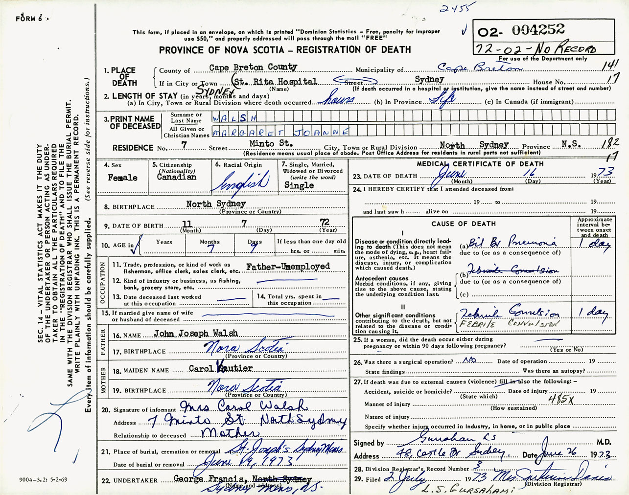 Female Death Registration: Year: 1973 number: 4252