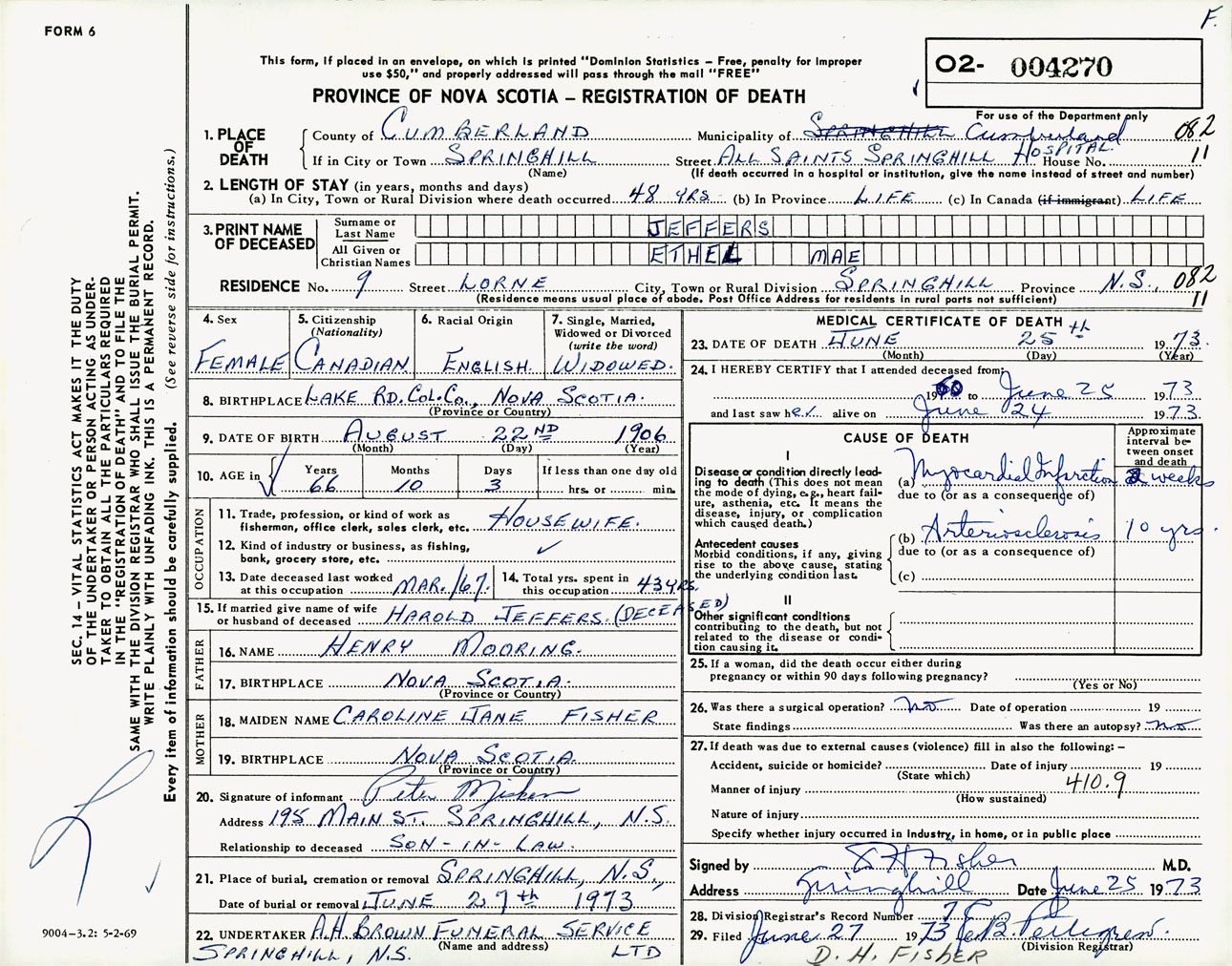 Female Death Registration: Year: 1973 number: 4270