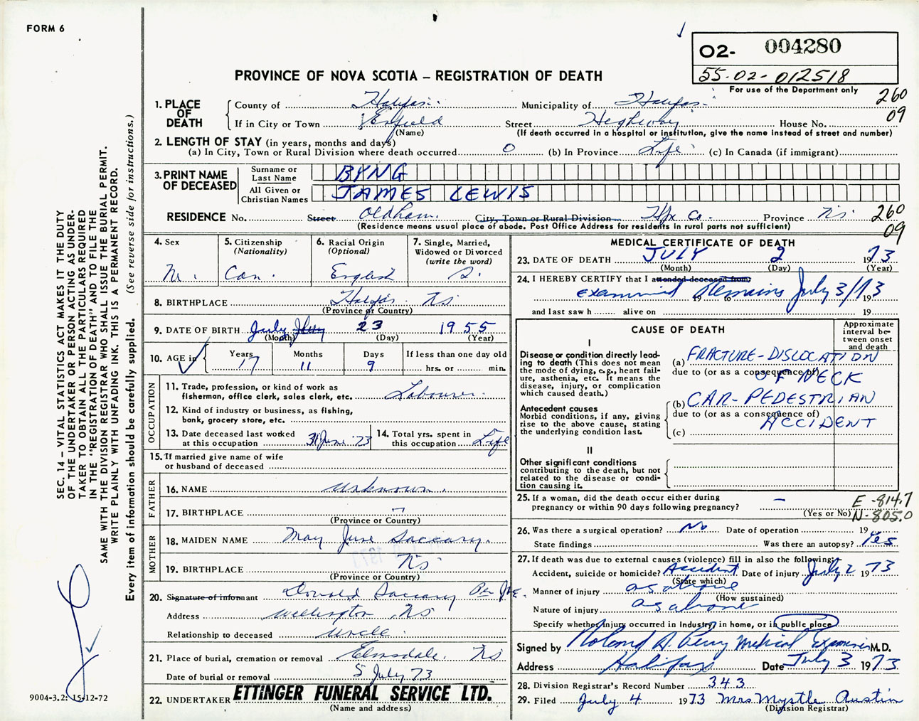 Male Death Registration: Year: 1973 number: 4280