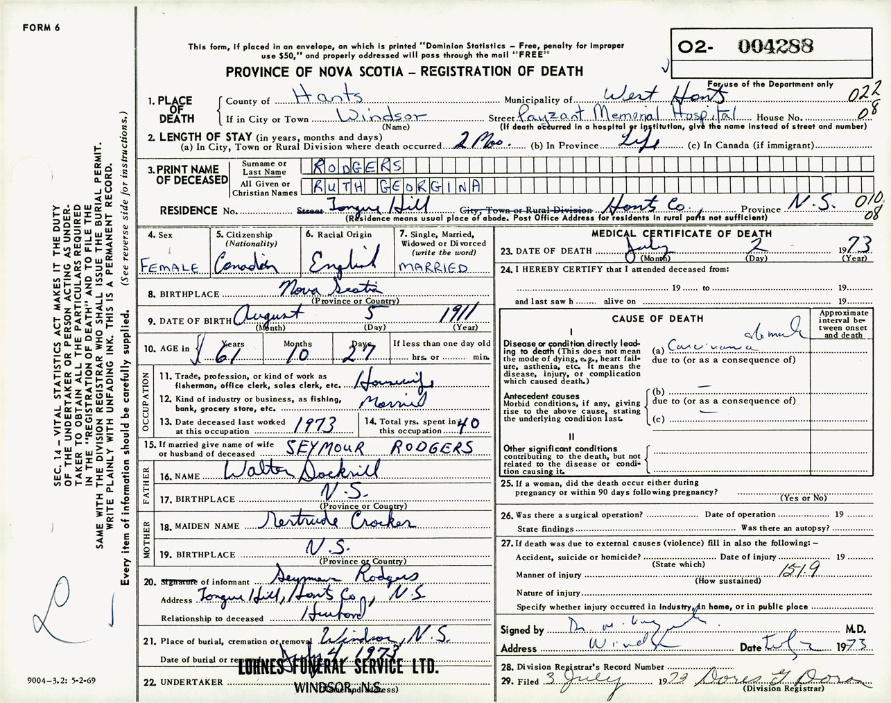 Female Death Registration: Year: 1973 number: 4288