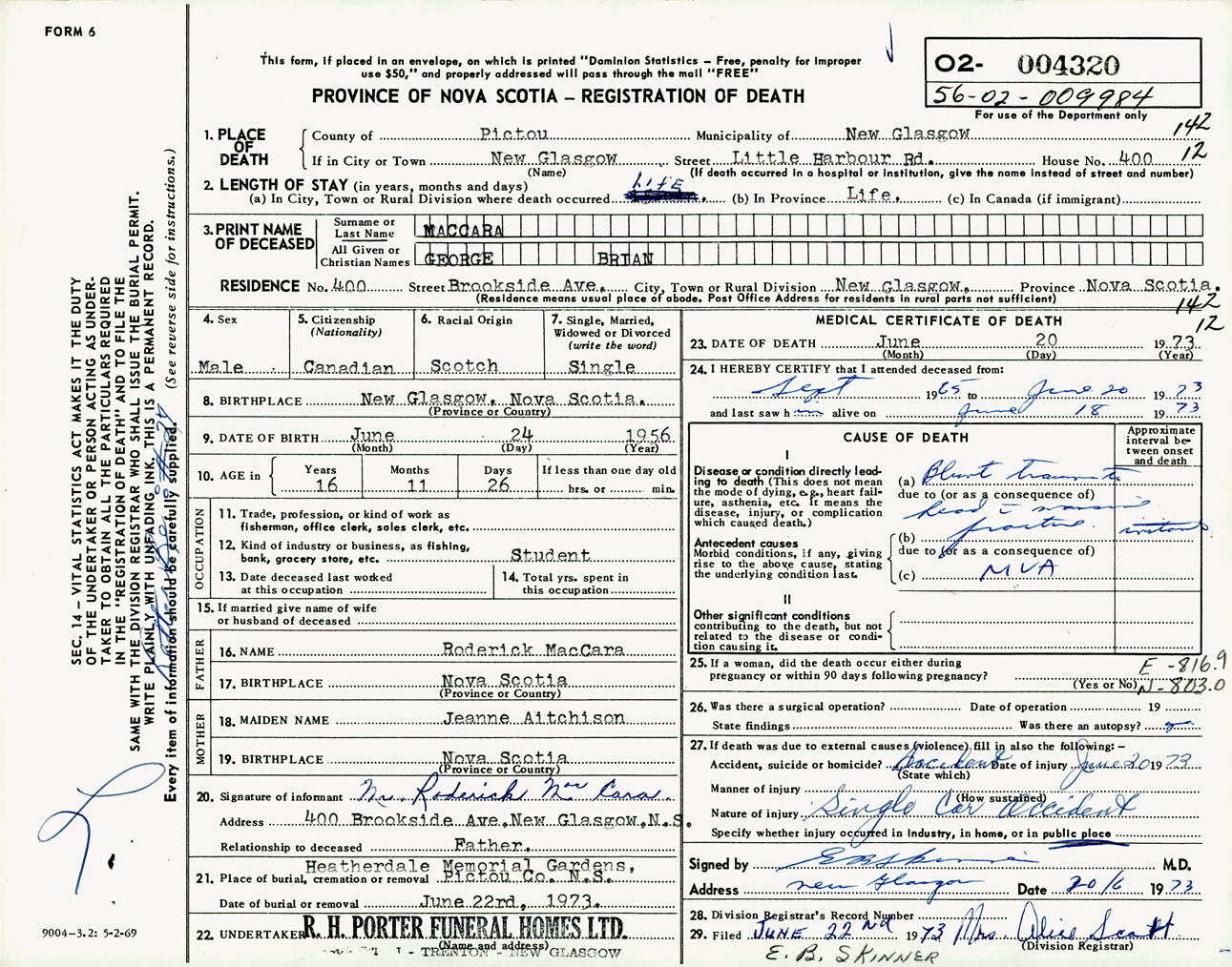 Male Death Registration: Year: 1973 number: 4320