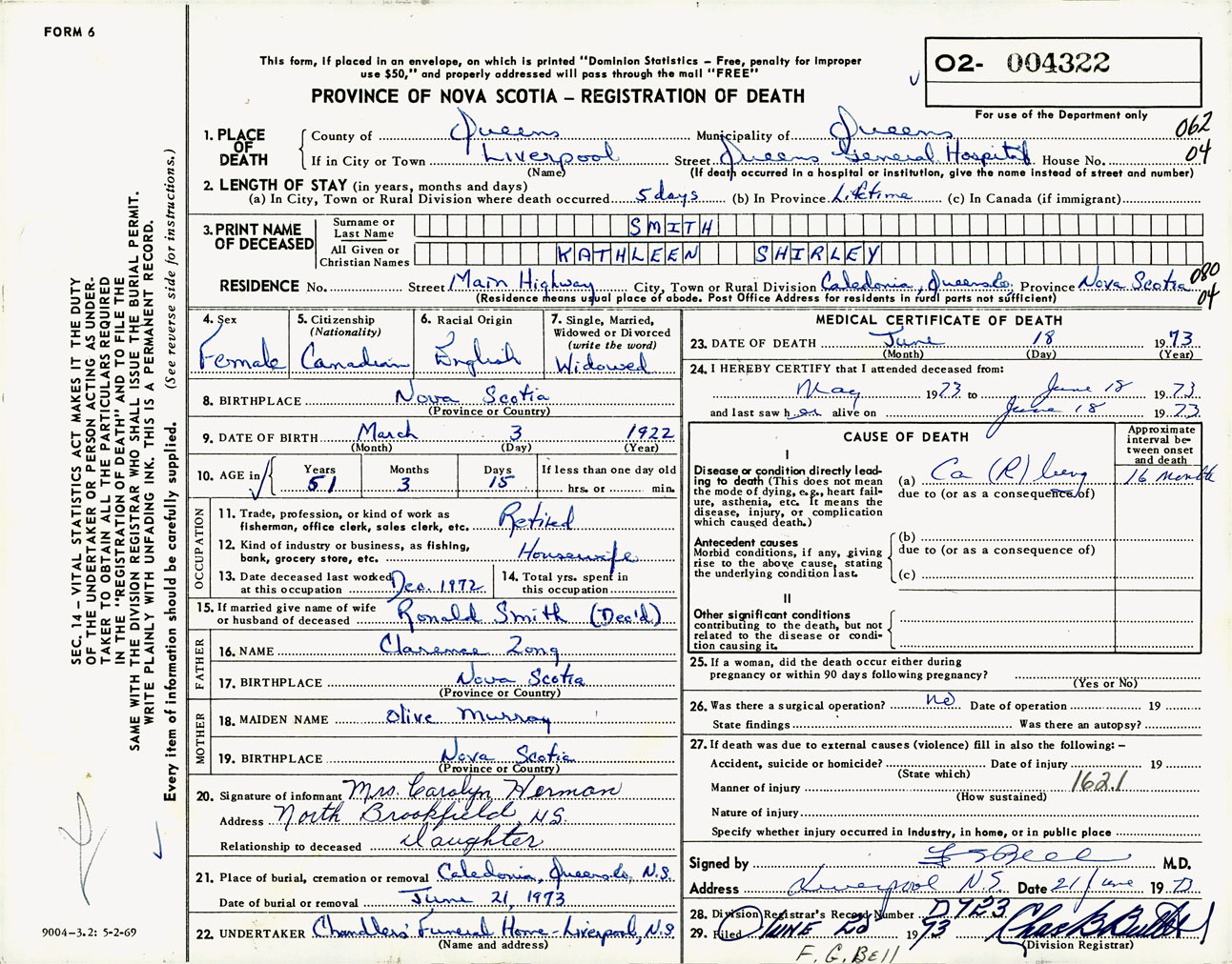 Female Death Registration: Year: 1973 number: 4322