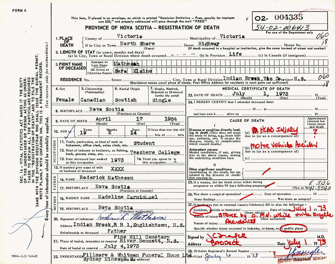 Female Death Registration: Year: 1973 number: 4335