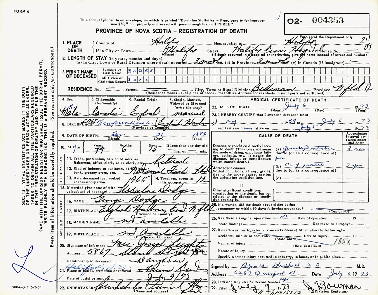 Male Death Registration: Year: 1973 number: 4353