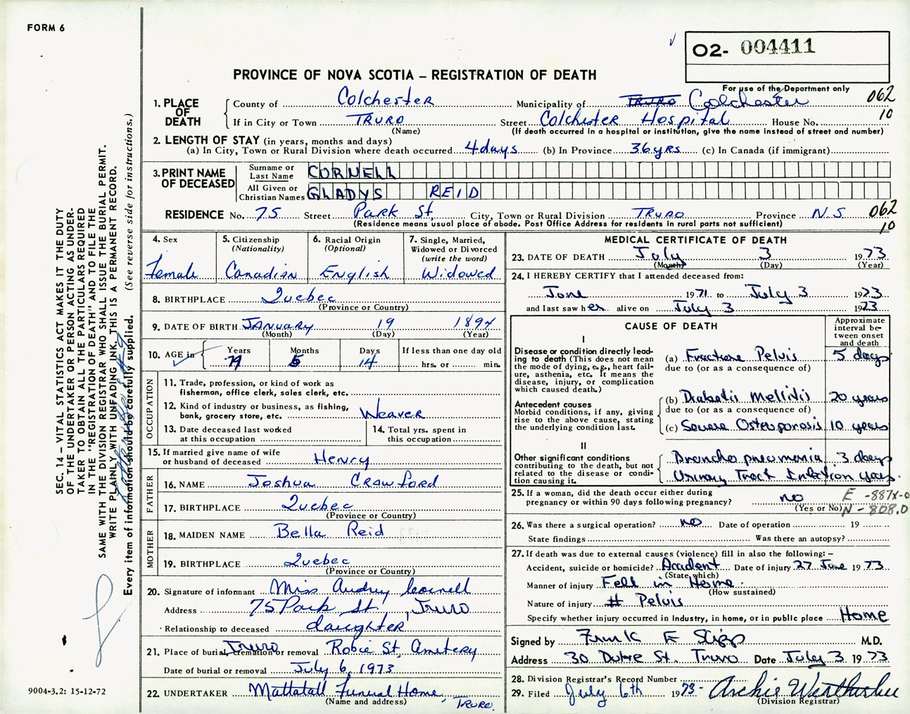 Female Death Registration: Year: 1973 number: 4411
