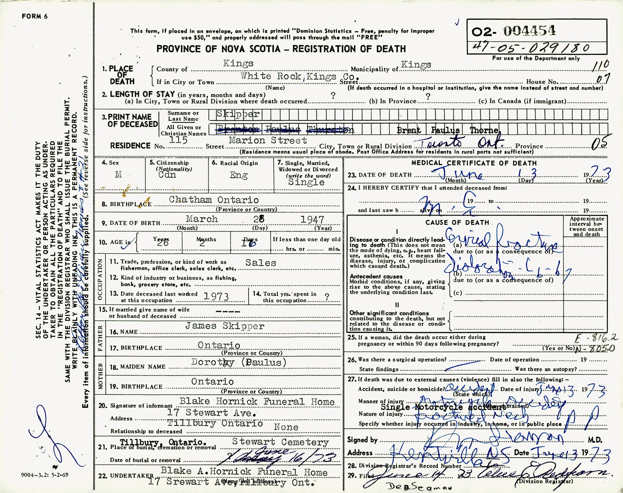 Male Death Registration: Year: 1973 number: 4454