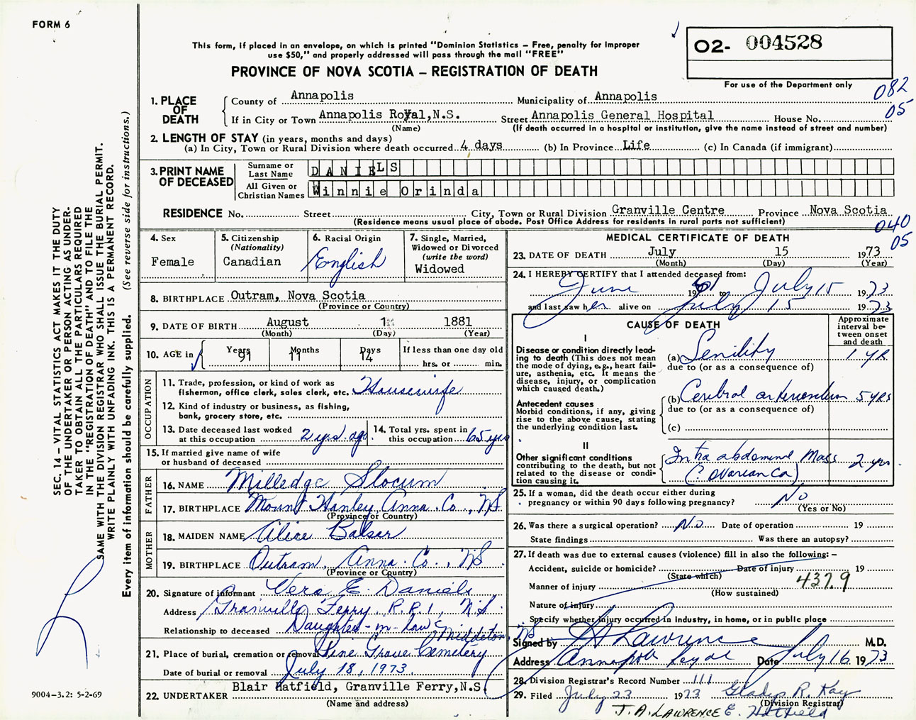 Female Death Registration: Year: 1973 number: 4528