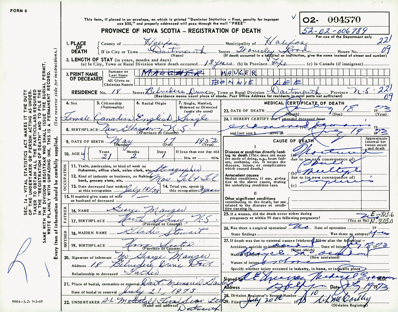 Female Death Registration: Year: 1973 number: 4570