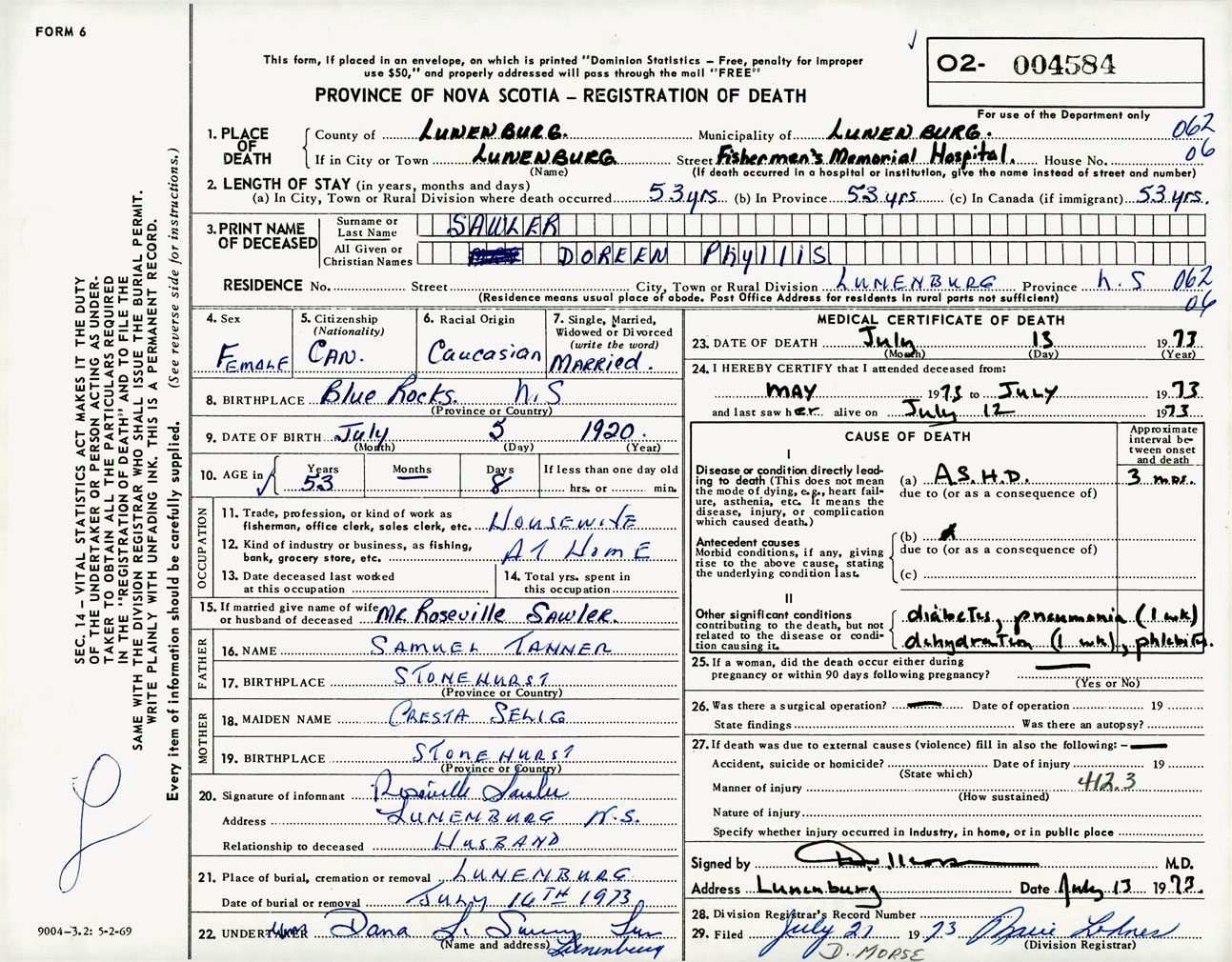 Female Death Registration: Year: 1973 number: 4584