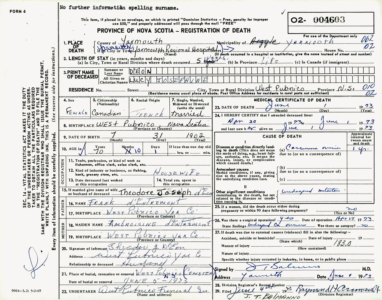 Female Death Registration: Year: 1973 number: 4603