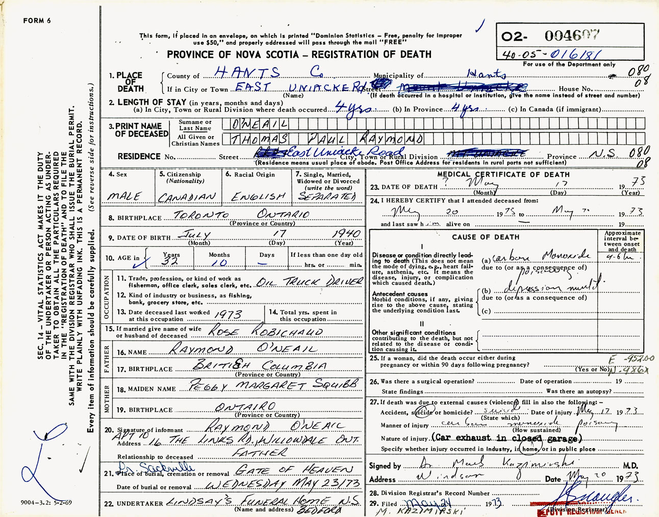 Male Death Registration: Year: 1973 number: 4607