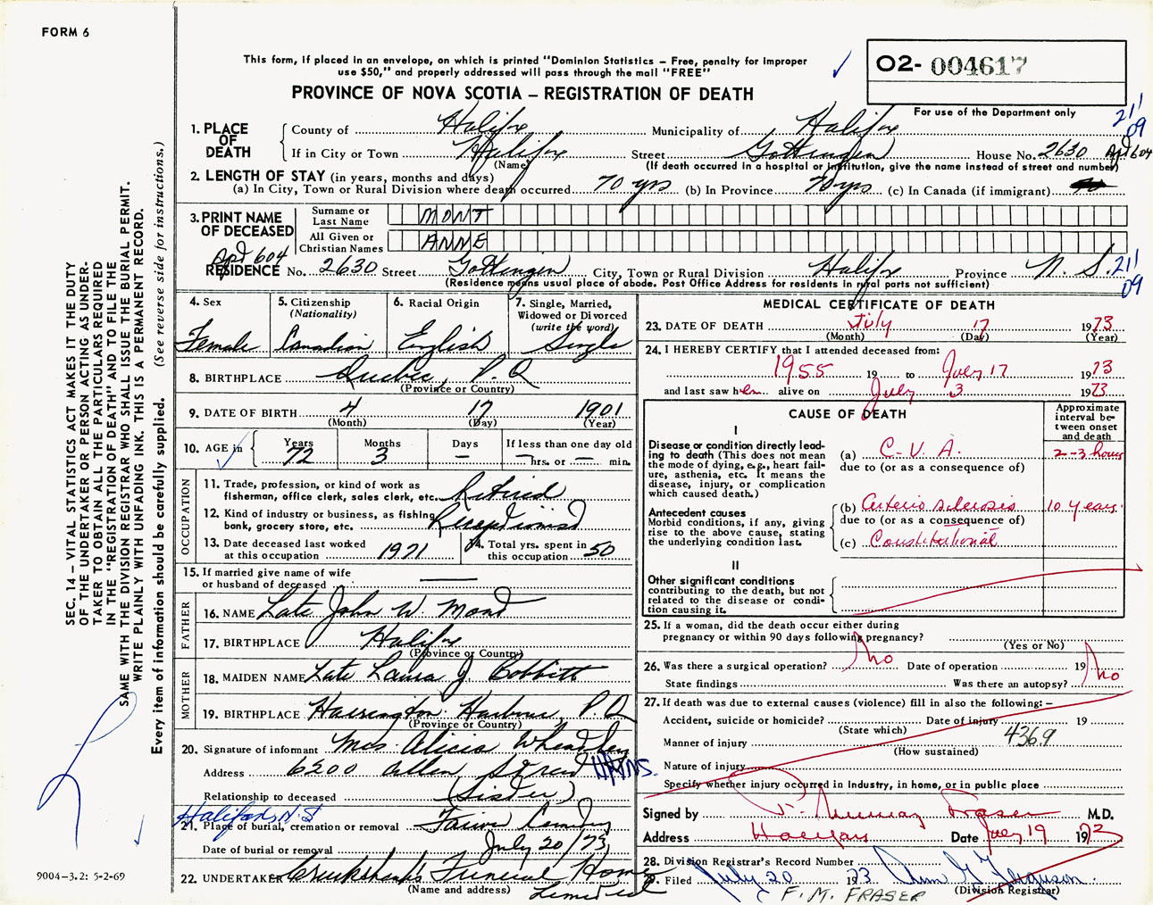 Female Death Registration: Year: 1973 number: 4617