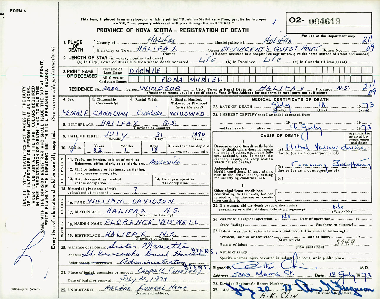 Female Death Registration: Year: 1973 number: 4619