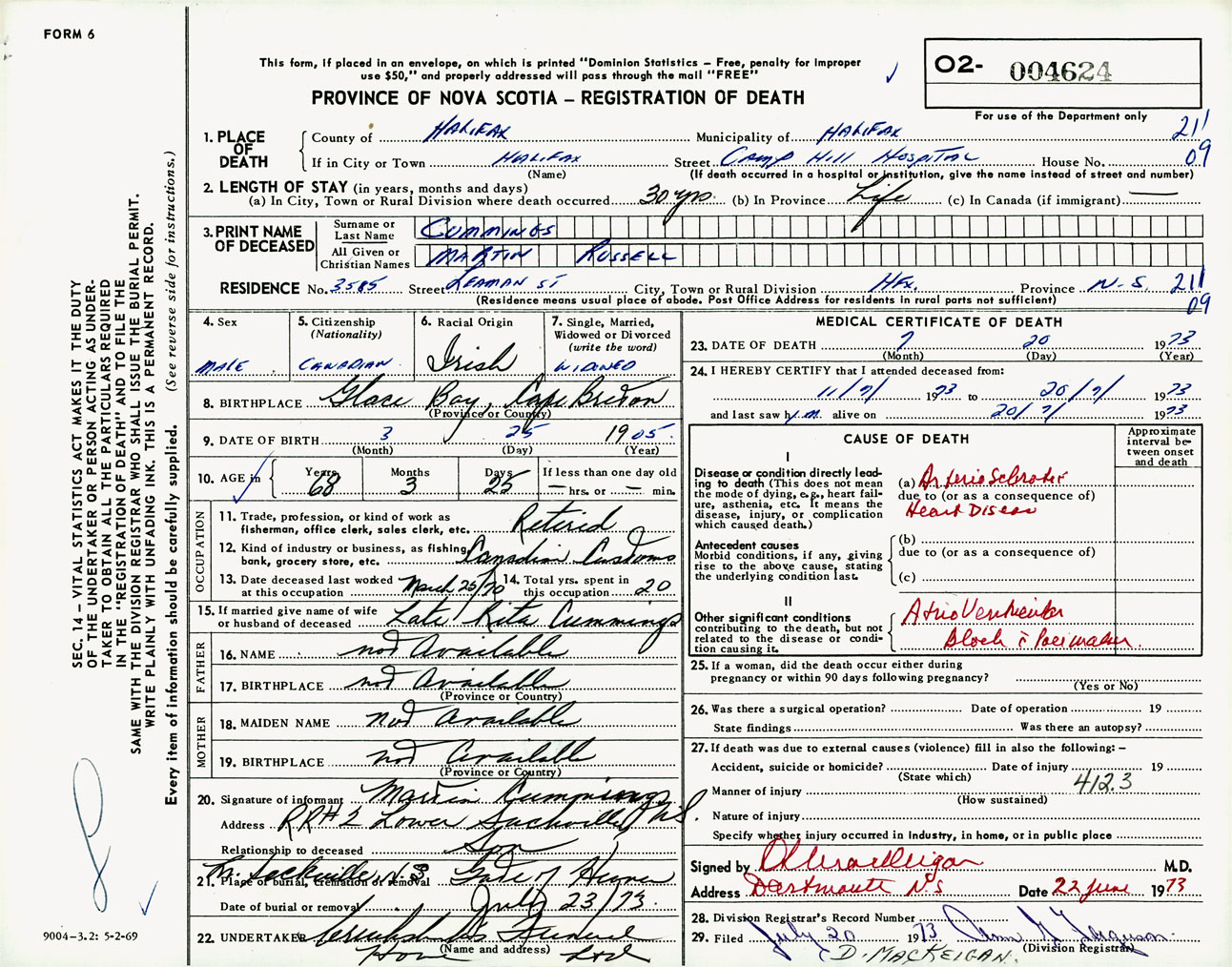 Male Death Registration: Year: 1973 number: 4624