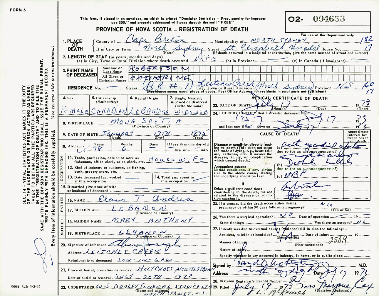 Female Death Registration: Year: 1973 number: 4653