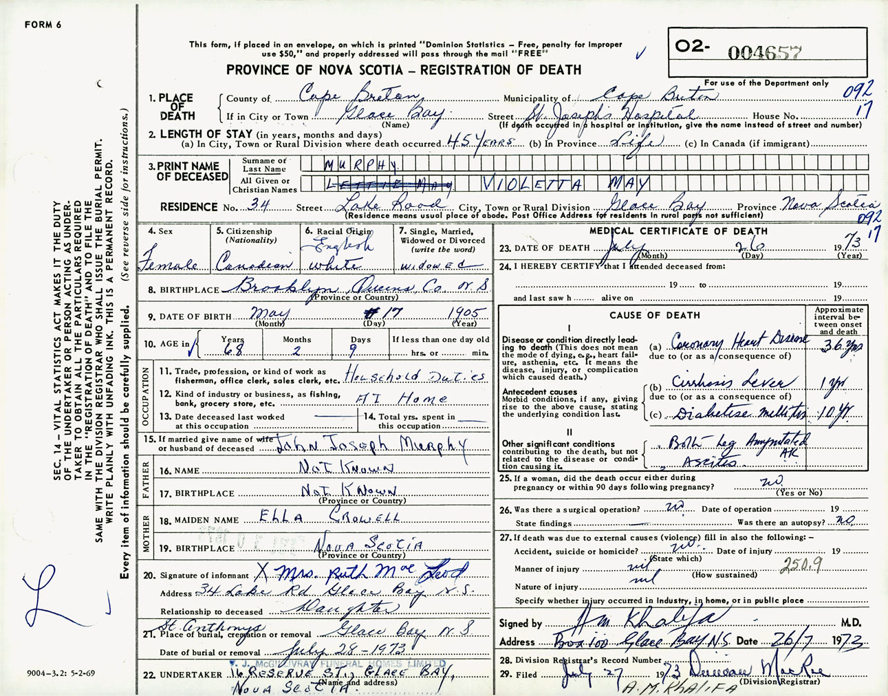 Female Death Registration: Year: 1973 number: 4657