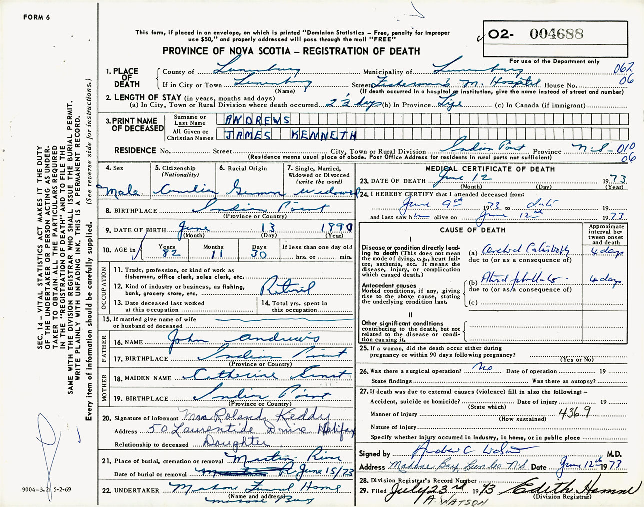 Male Death Registration: Year: 1973 number: 4688