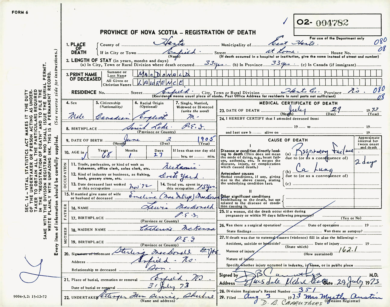 Male Death Registration: Year: 1973 number: 4782