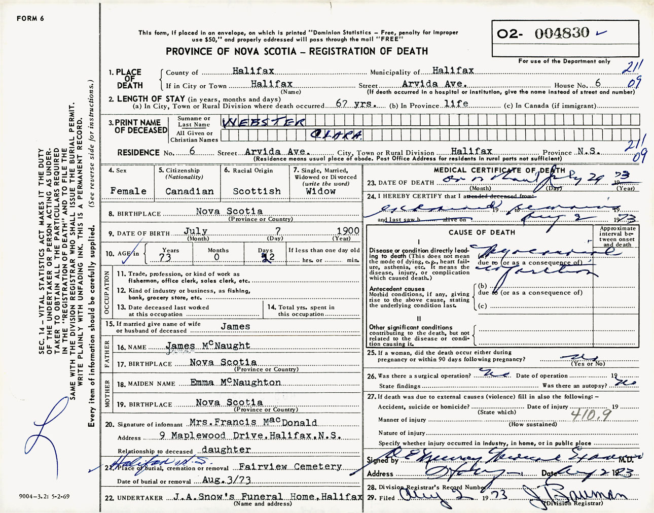 Female Death Registration: Year: 1973 number: 4830