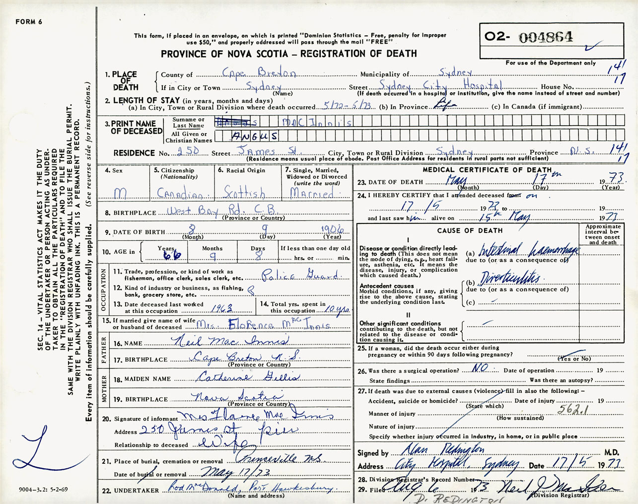 Male Death Registration: Year: 1973 number: 4864