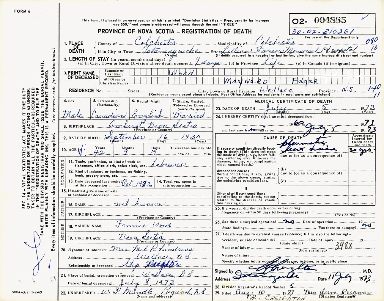 Male Death Registration: Year: 1973 number: 4885