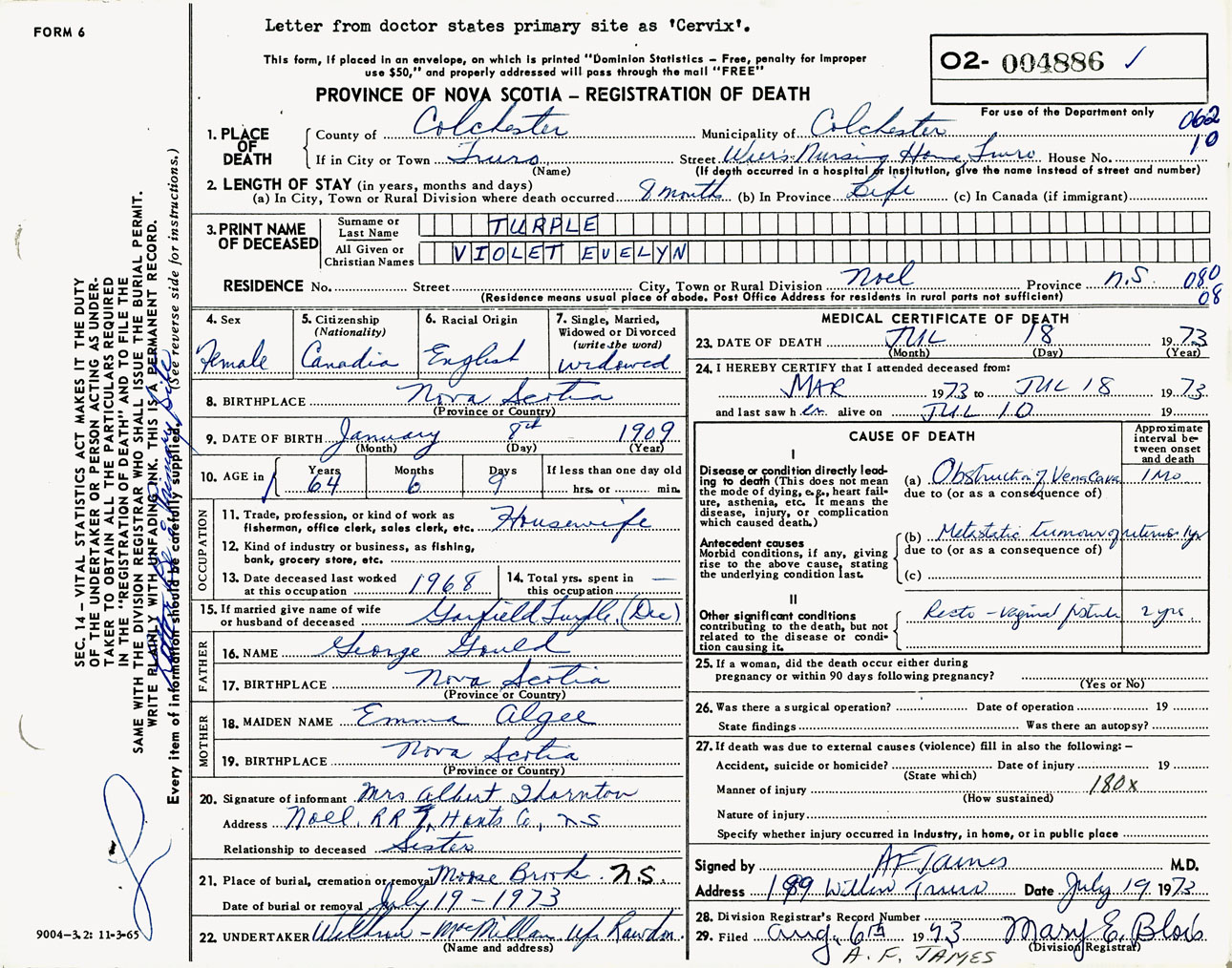 Female Death Registration: Year: 1973 number: 4886