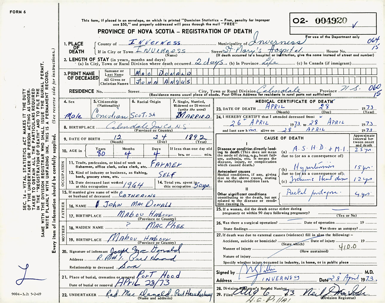 Male Death Registration: Year: 1973 number: 4920