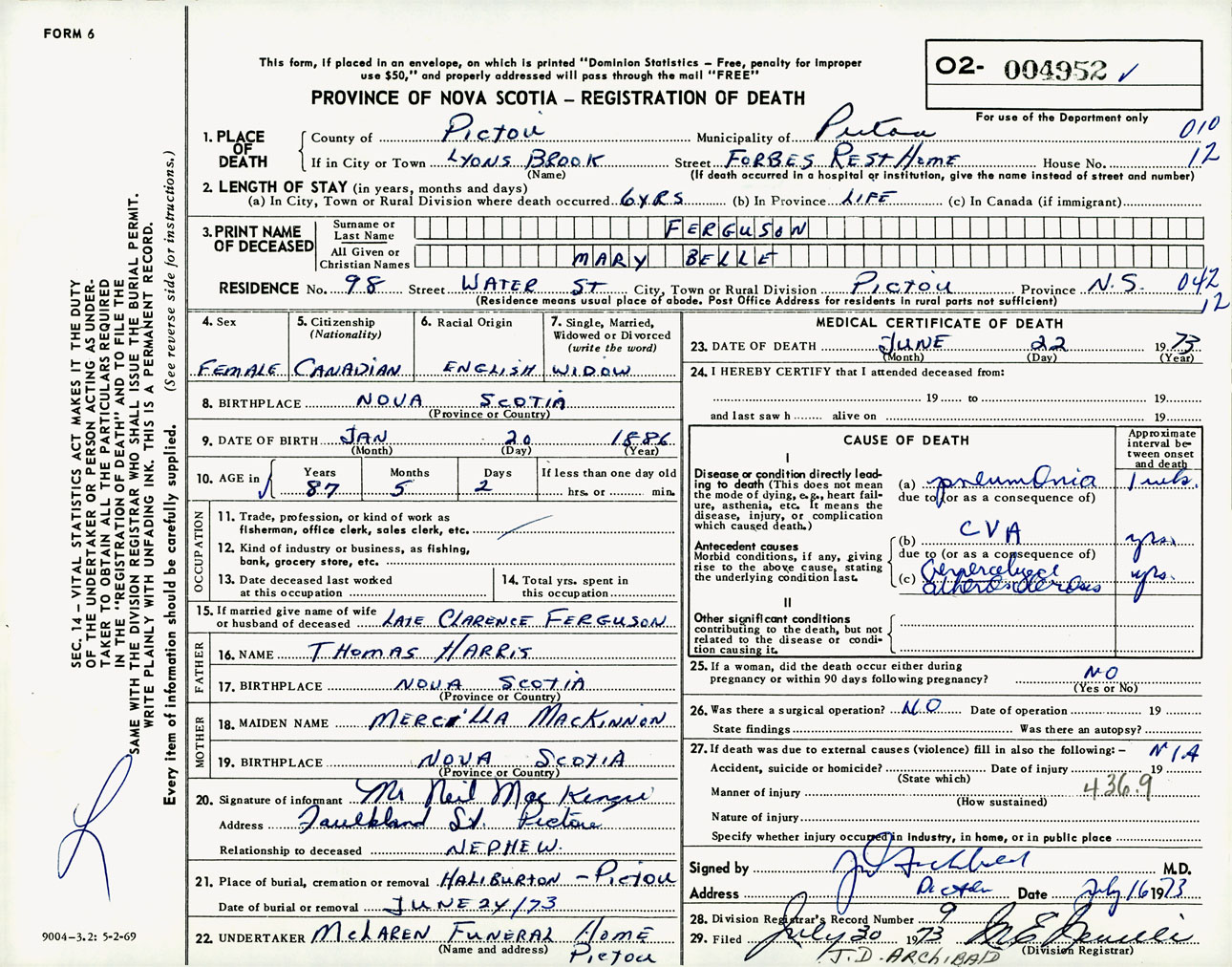 Female Death Registration: Year: 1973 number: 4952
