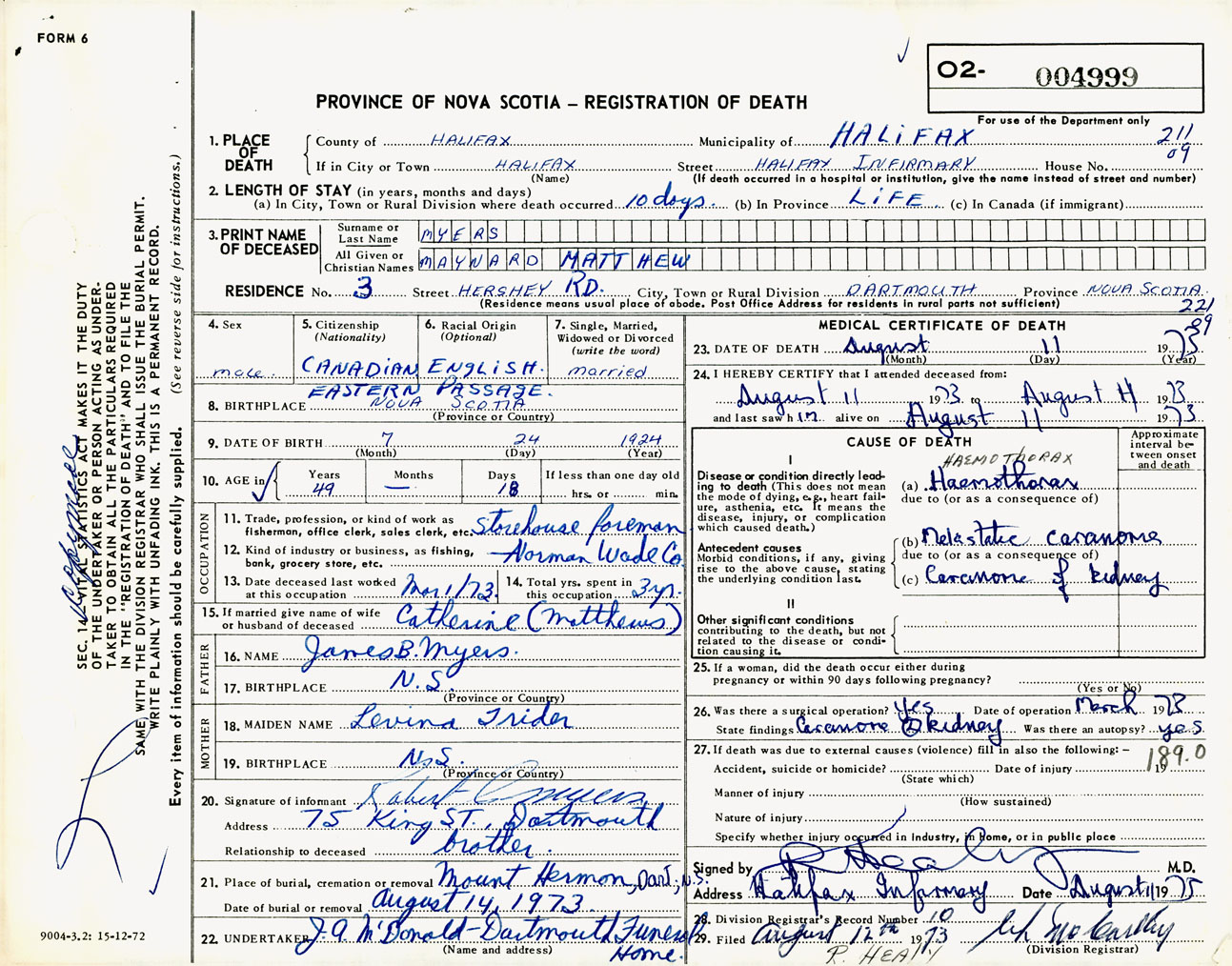 Male Death Registration: Year: 1973 number: 4999
