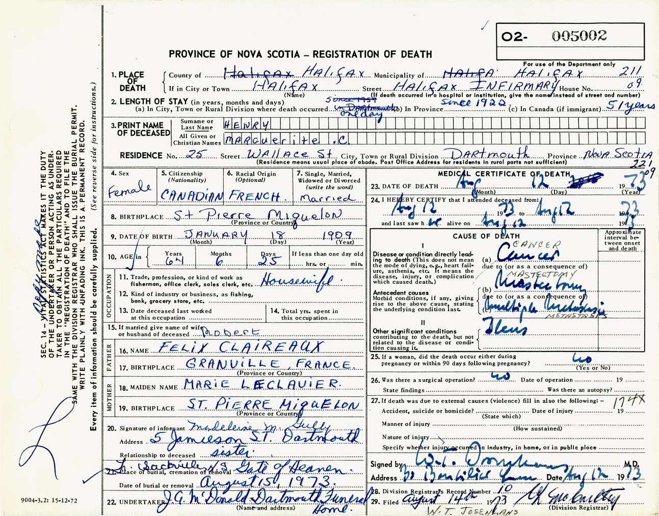 Female Death Registration: Year: 1973 number: 5002