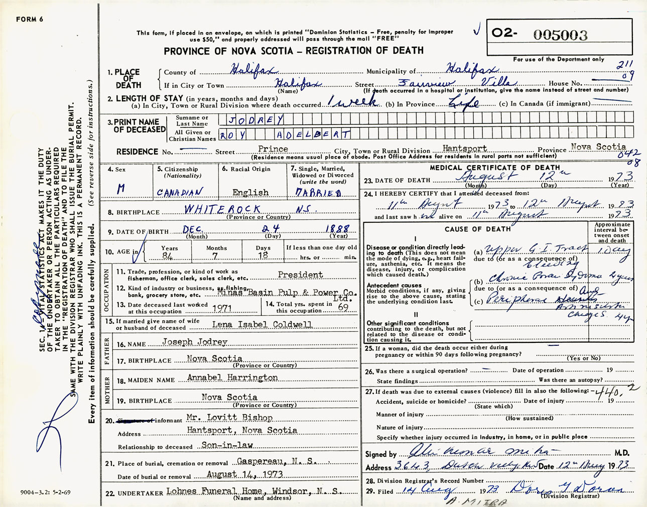 Male Death Registration: Year: 1973 number: 5003