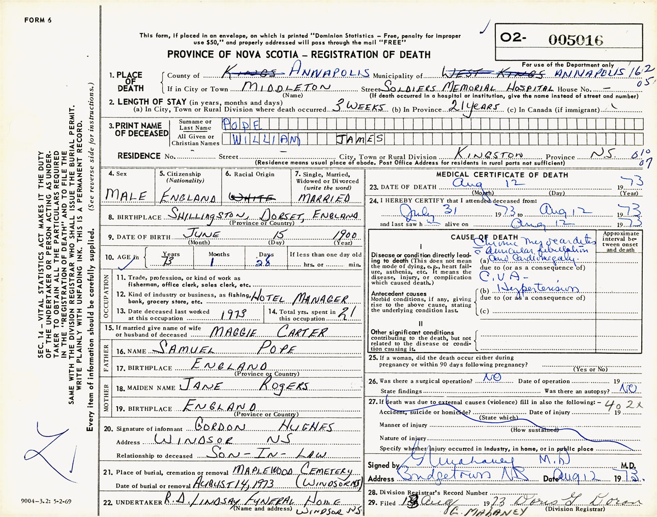 Male Death Registration: Year: 1973 number: 5016