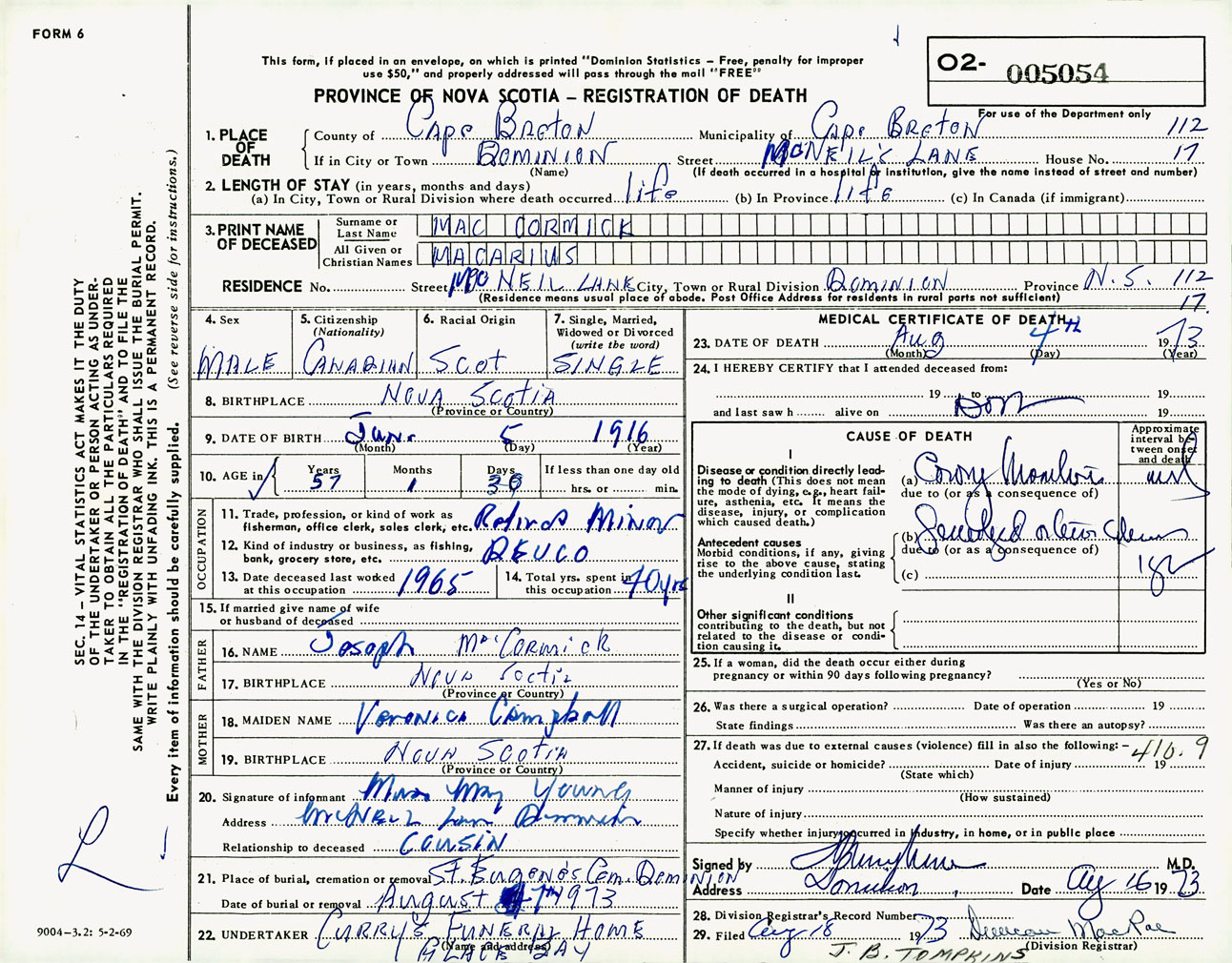 Male Death Registration: Year: 1973 number: 5054