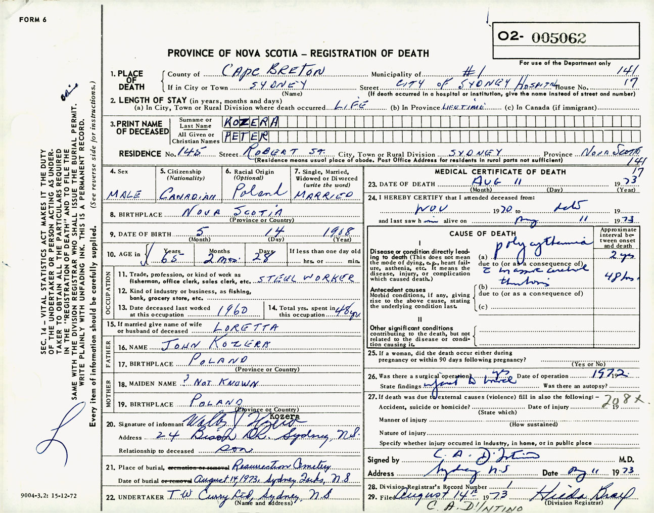 Male Death Registration: Year: 1973 number: 5062