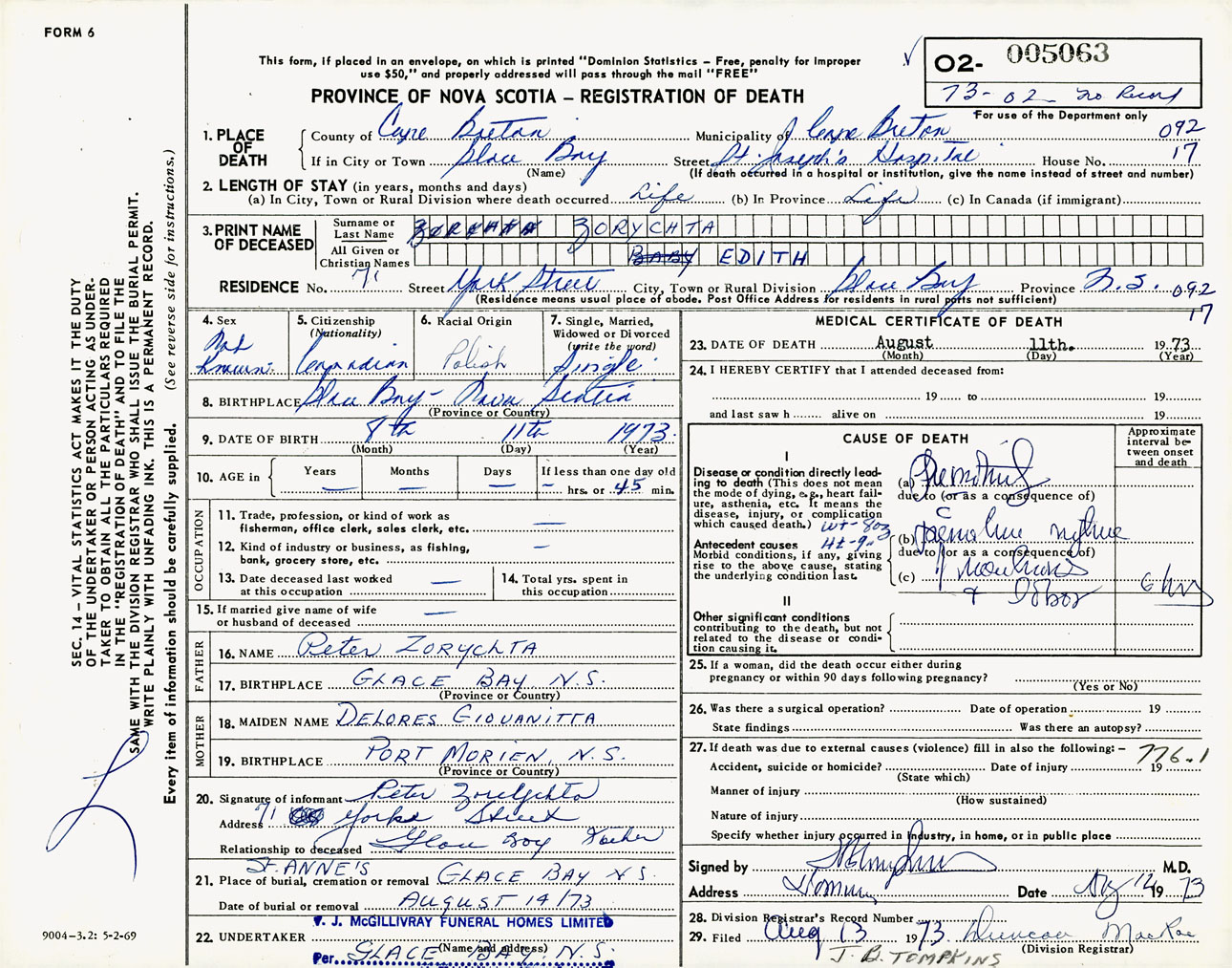Female Death Registration: Year: 1973 number: 5063