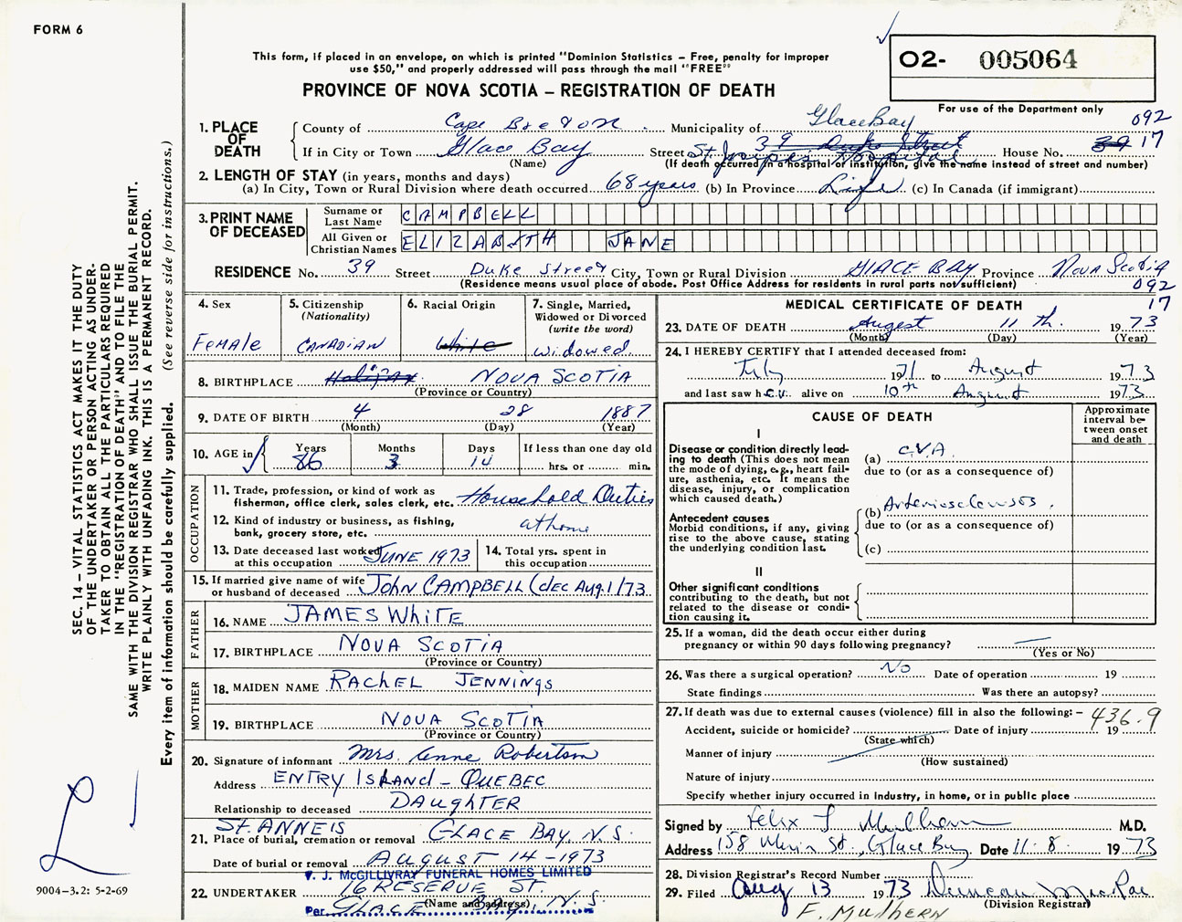 Female Death Registration: Year: 1973 number: 5064