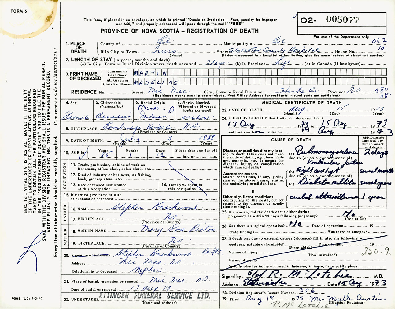 Female Death Registration: Year: 1973 number: 5077