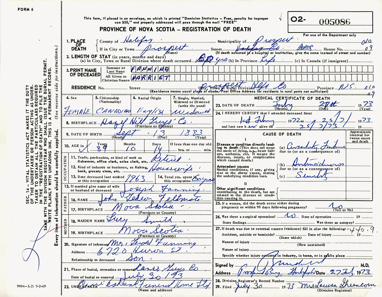 Female Death Registration: Year: 1973 number: 5086