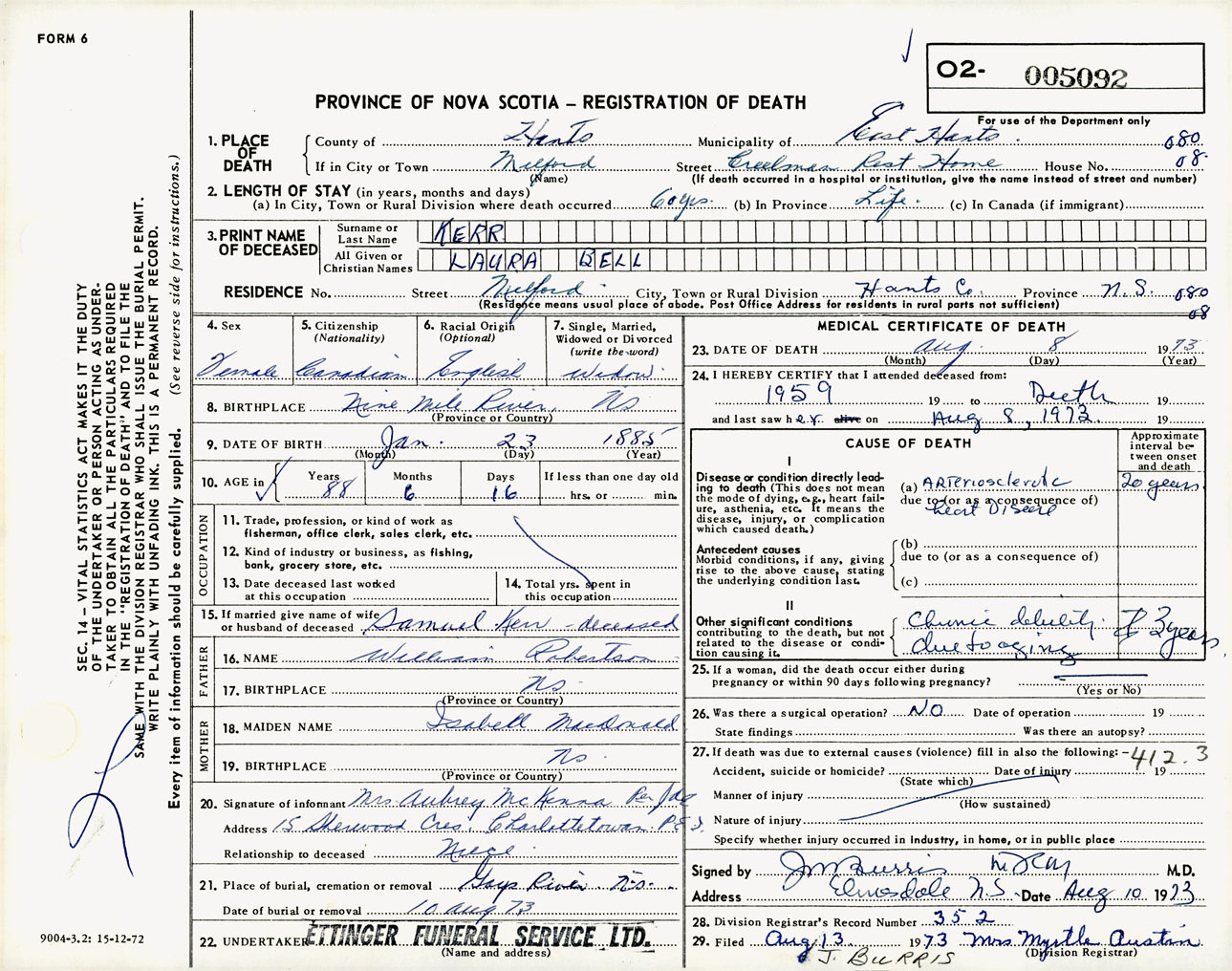 Female Death Registration: Year: 1973 number: 5092