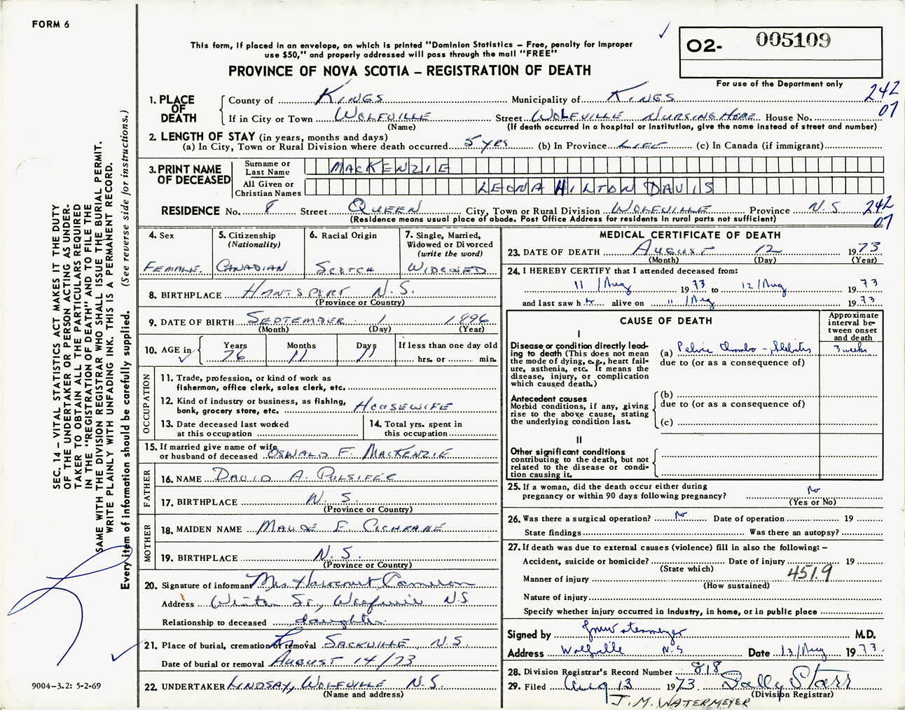 Female Death Registration: Year: 1973 number: 5109
